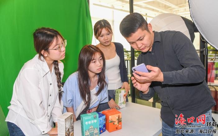 11月13日,海南工商職業學院學生(左邊三位)在海南您好傳媒科技集團有限公司參觀跨境電商直播基地。記者 康登淋 攝