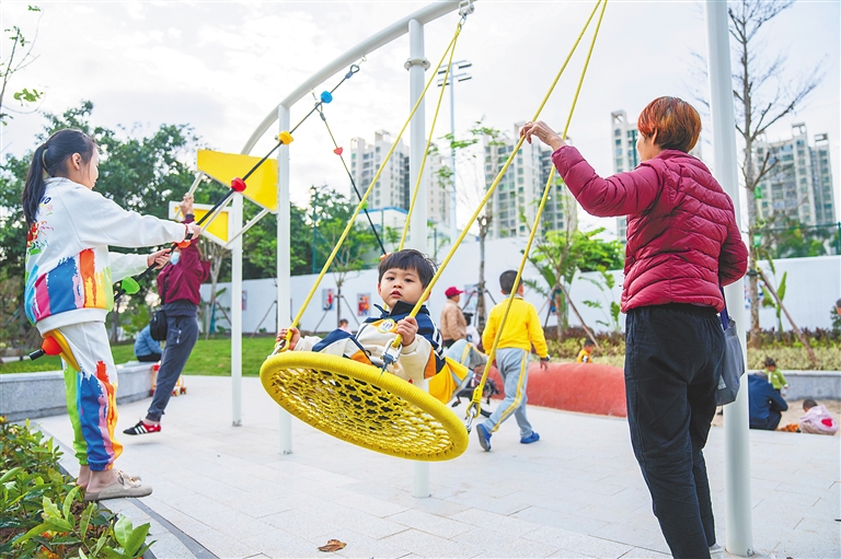 11月19日,海口市椰海大道與新大洲大道交叉口的椰新園,小朋友正在蕩秋千。這座新近開(kāi)放的“口袋公園”有多種健身和游樂(lè)設(shè)施,成了周邊居民休閑鍛煉的好去處。